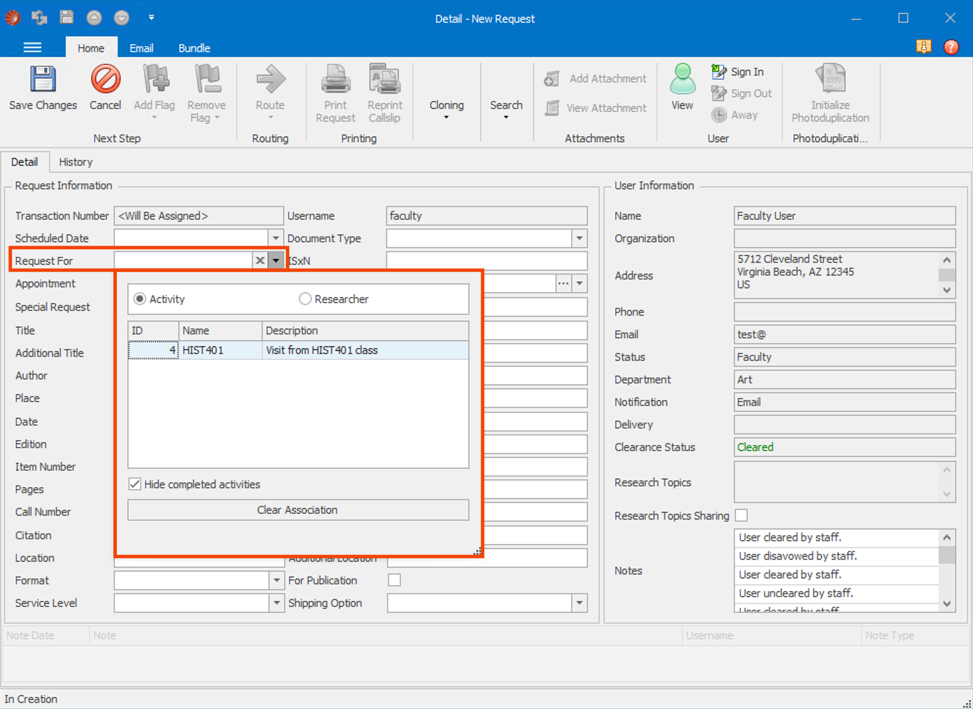 To remove a requested item from an Activity click the "x" in the "Request For" option in the Request Detail screen. This automatically clears the association with the Activity. You can also open the Request For field and click Clear Association to remove the request from the Activity. The request will remain active for the individual user. In this case, a new processing status should be selected for it from the Route button in the ribbon. If you decide later to reassociate the request with the Activity, you can click on the Request For field and restore the association.