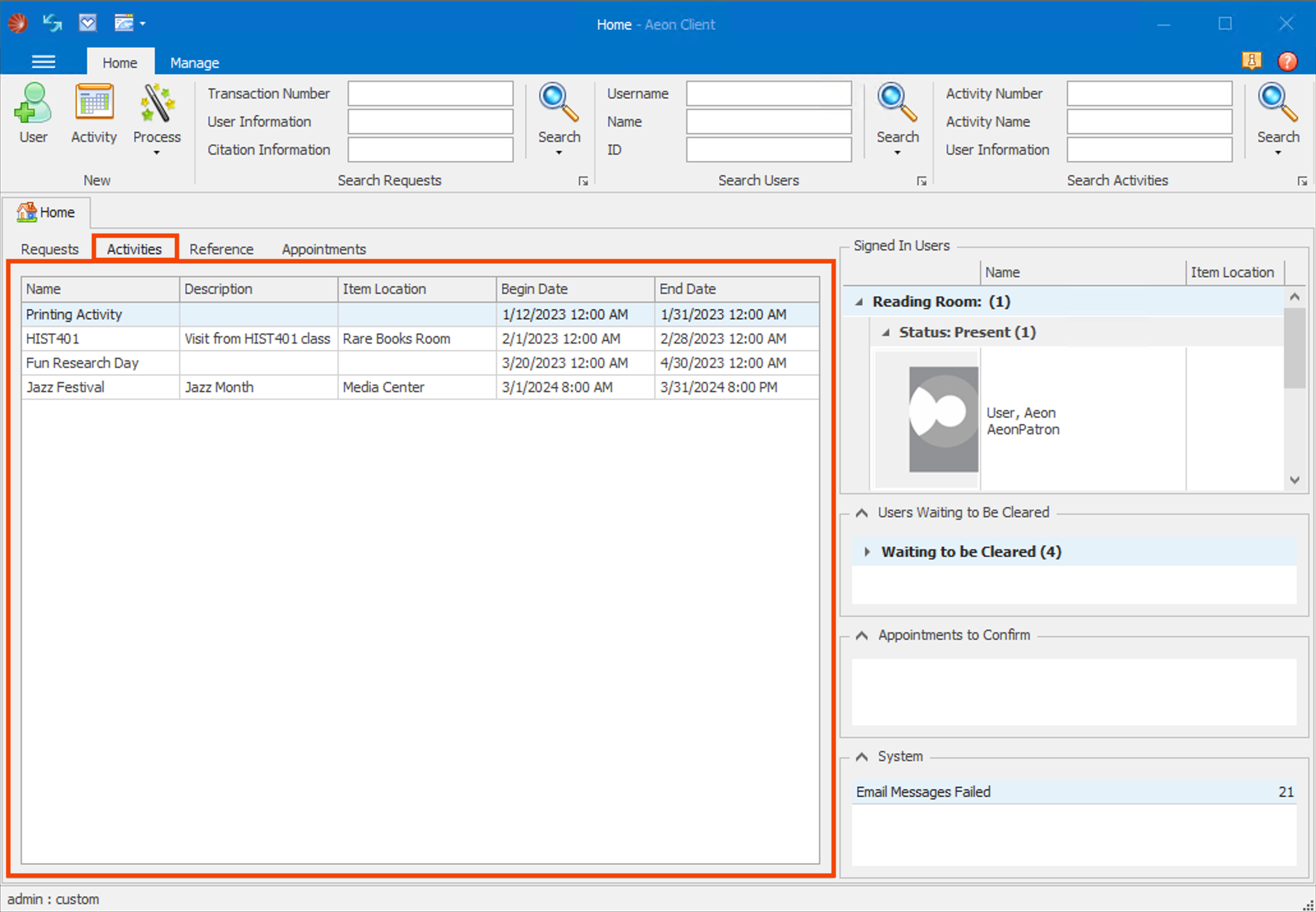 Aeon allows staff to create Activities in the Aeon Desktop Client so that researchers can request items and associate them with the Activity. Activities are separated from the Requests on the Aeon Desktop Client Home page and have their own Activity Information form. Multiple users, both researchers and staff, can be associated with an Activity. Staff can track daily attendance at the Activity, and Activities and their requests can be cloned.