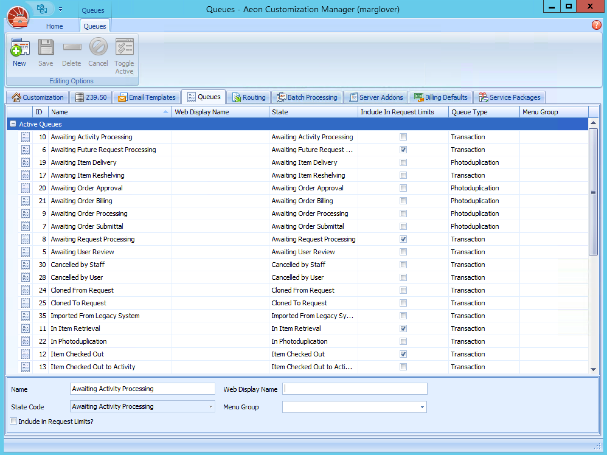 Aeon uses default status queues to move item requests through the standard reading room and photoduplication workflow processes. You can create custom queues if you would like additional queues for processing requests. Custom queues are based on and replicate the processes of, the standard default queues. The Queues table is stored in the database and is visible from the Aeon Customization Manager. Custom queues are created using the Queues table in the Aeon Customization Manager.