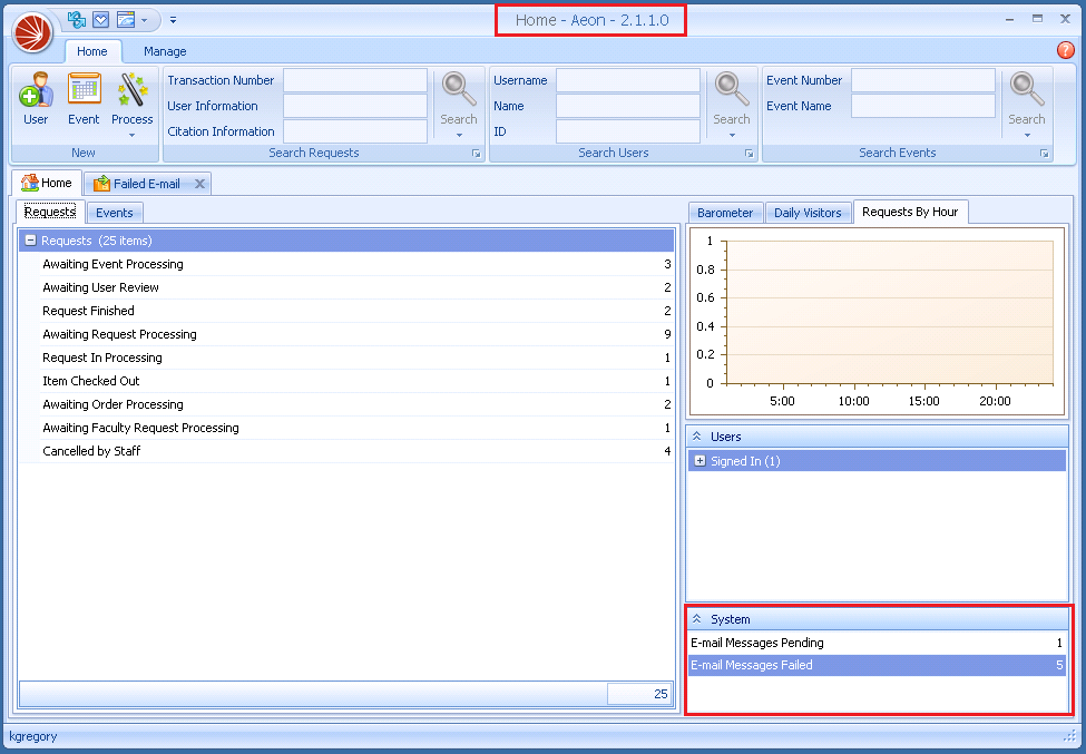 The System window on the Home page of the Aeon Desktop Client allows Special Collections staff a window into the activity of sent emails. This is the place to view and manage failed and pending emails. You can access pending or failed emails by clicking the appropriate row in the System window on the Home page. Failed and pending emails can only be accessed from the Aeon Desktop Client and cannot be accessed from the Aeon Web Client.