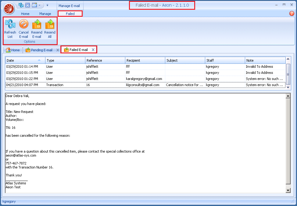 - Cancel E-mail: Cancels the email and removes it from the Aeon database.