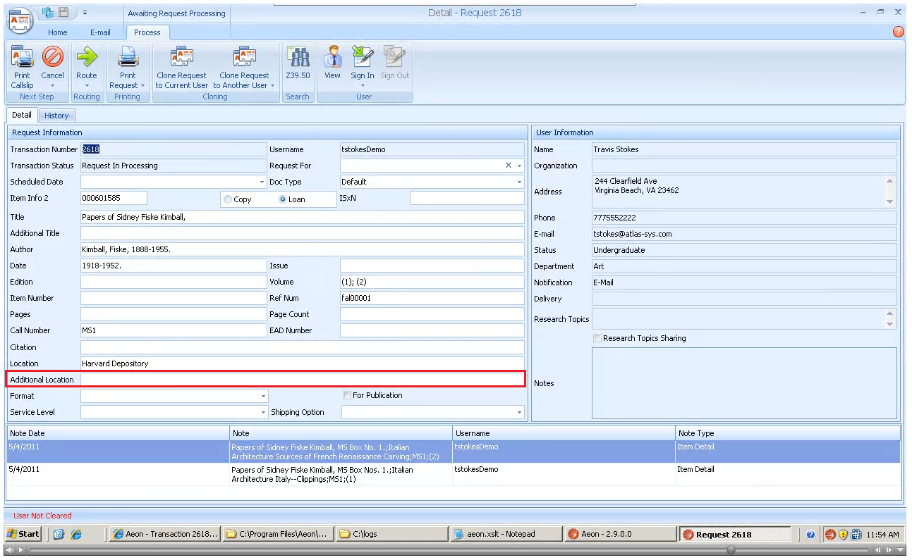 Aeon compiled a list of all the field values that were available for each individual request and created the transaction notes by concatenating all of those values delimited with a semicolon.