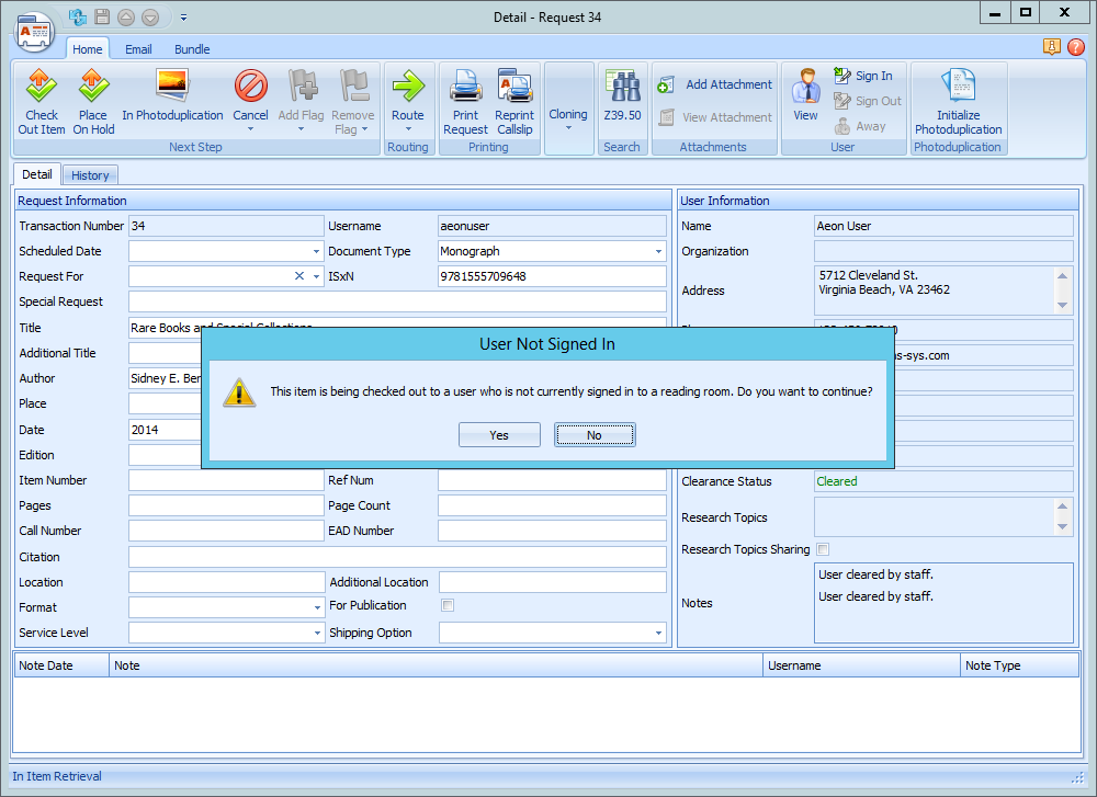 If a staff user tries to check out an item for a researcher who is not signed in, by default the Aeon Desktop Client will display a warning message. This message will appear if: