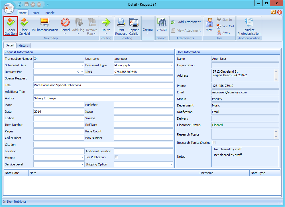 Items can be checked out from the Aeon Desktop Client using the Next Step ribbon group when they are in the In Item Retrieval or Remove from Hold transaction statuses. On the Request form, click the Check Out Item button in the Next Step group of the Home ribbon. The item automatically moves to the next status of Item Checked Out and the Request form closes. This status, (along with Item Checked Out to Activity and any custom queues created) displays in the user's Outstanding Requests list on the web.