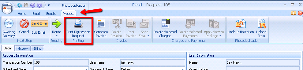 You can print a separate photoduplication ticket from the Aeon Desktop Client by clicking the Print Digitization Request button on the Process ribbon of the Request form. This print template can be customized to include additional information related to Bundles, Activities, and Billing Details.