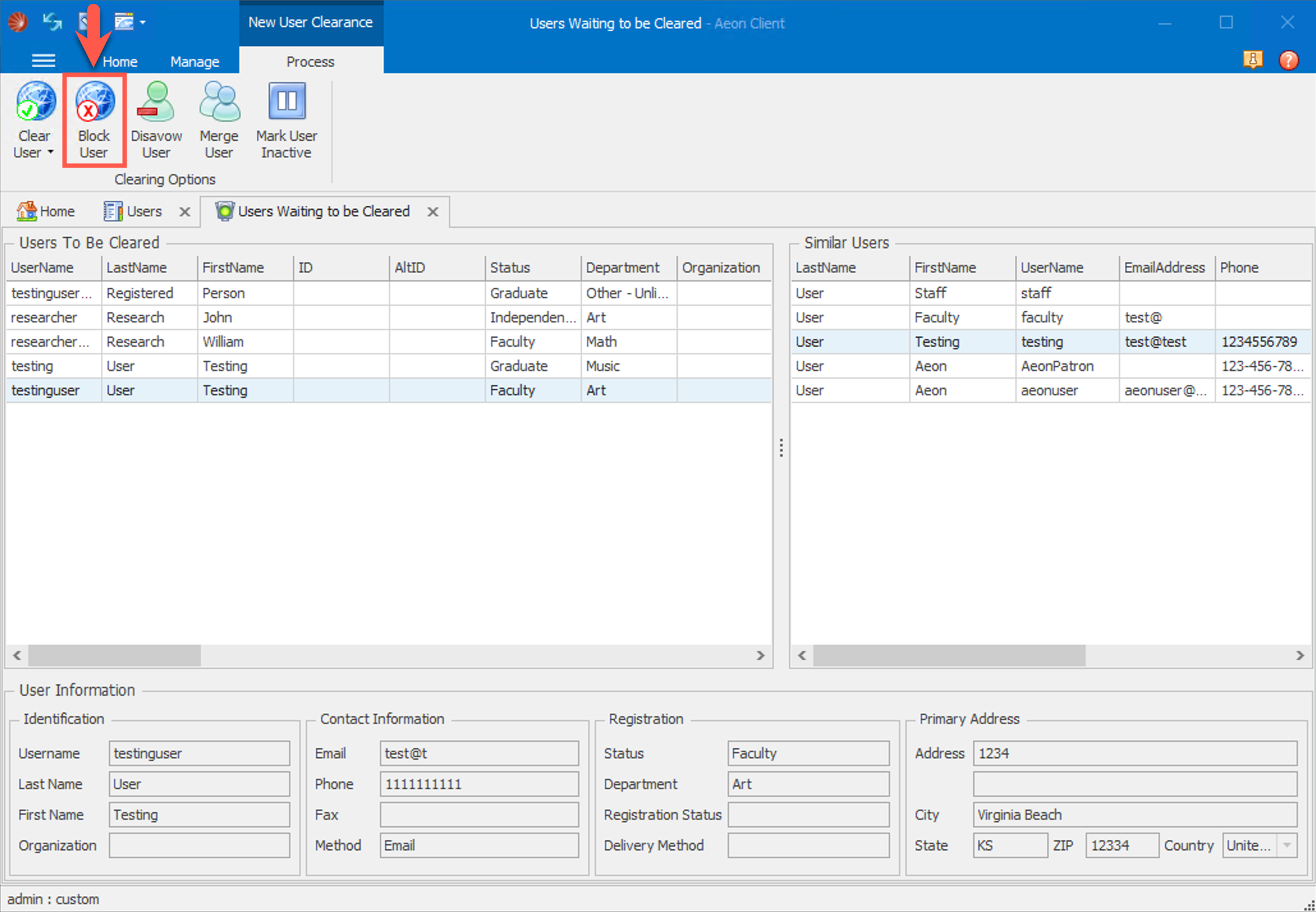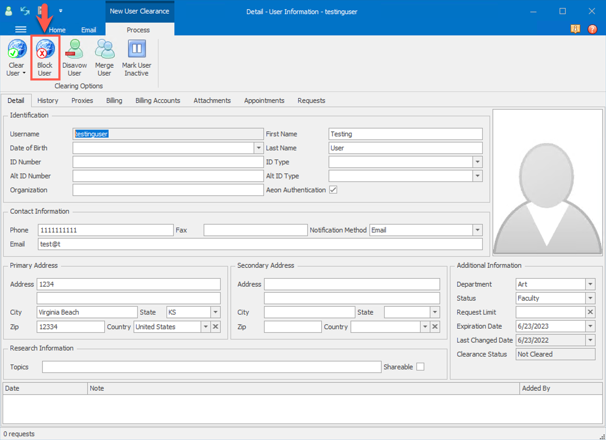 3. Click the Block User button in the Clearing Options group of the Process ribbon.