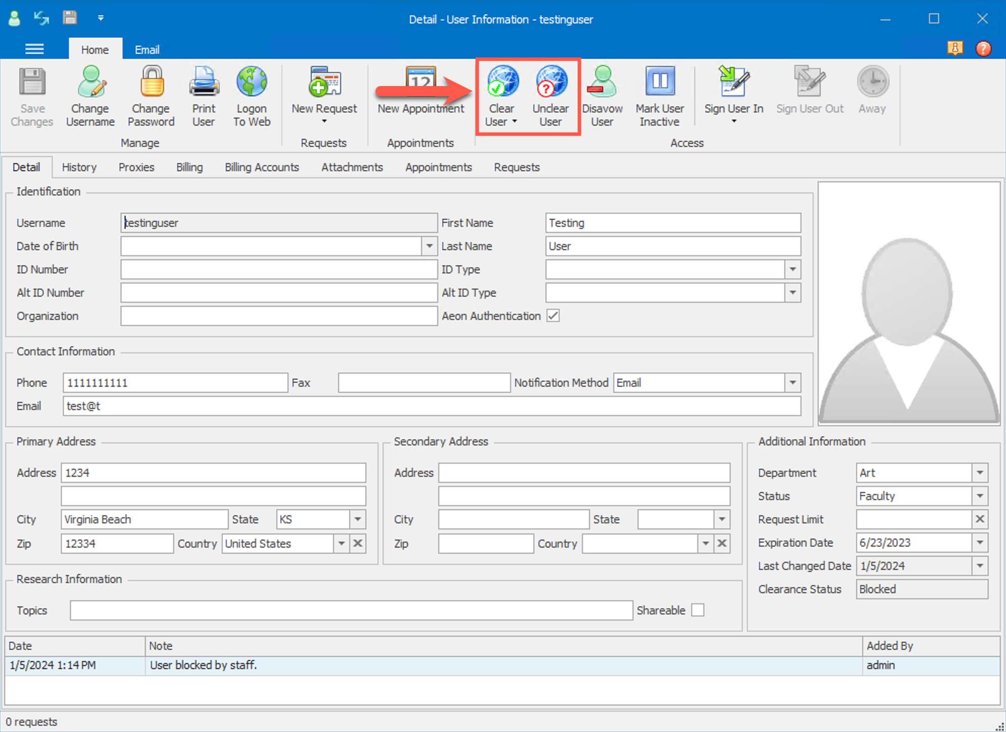 1. To unblock a blocked user, simply click the Clear User or Unclear User icon in the Home ribbon of the User Information form.
