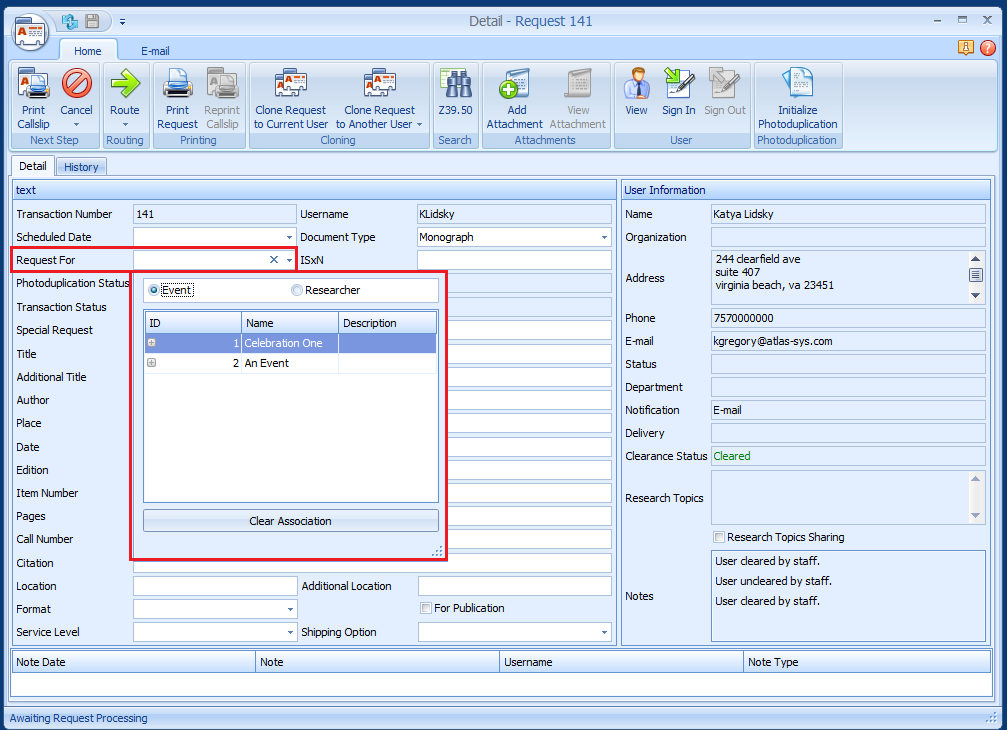 In the User Information Form, click the New Request for User icon located on the Home ribbon. This opens a new Request form for you to complete. Fill out the bibliographic information for the request. Be sure that the document type (Monograph, Serial or Monograph) is appropriate to the entered information. Save the new request by clicking Save Changes on the Process ribbon. Once you save the request, a Transaction Number is assigned and the Transaction Status is changed to Awaiting Request Processing. Because the request is open it also appears in the transitional status queue of Request in Processing should you want to begin processing the open item immediately. If you don't want to process the item immediately, simply close the Request form by clicking the x in the upper right corner. It will remain at the Awaiting Request Processing status.