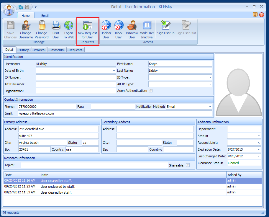 The New Request for User button will be deactivated (greyed out) if the user has been disavowed. Staff cannot place requests for disavowed users. The tooltip for the button will display the message "User is disavowed" to remind staff why this button is inactive.