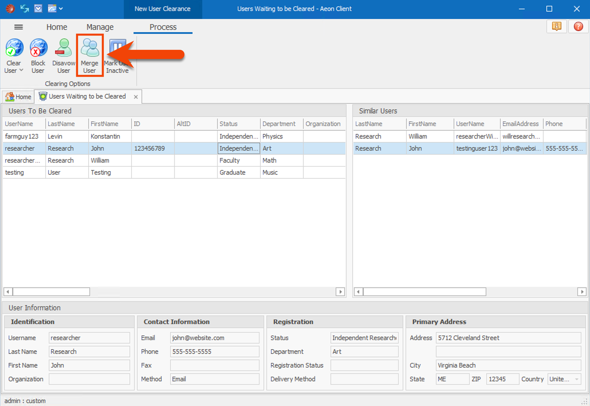 If you want to merge a user record that has already been cleared with another cleared user record, you must first go to the User Information form for the user you want to merge and unclear the user by clicking the Unclear User button on the Home ribbon. You can then click the Merge button on the Process ribbon to quickly open the Users Waiting to be Cleared form and perform the merge.