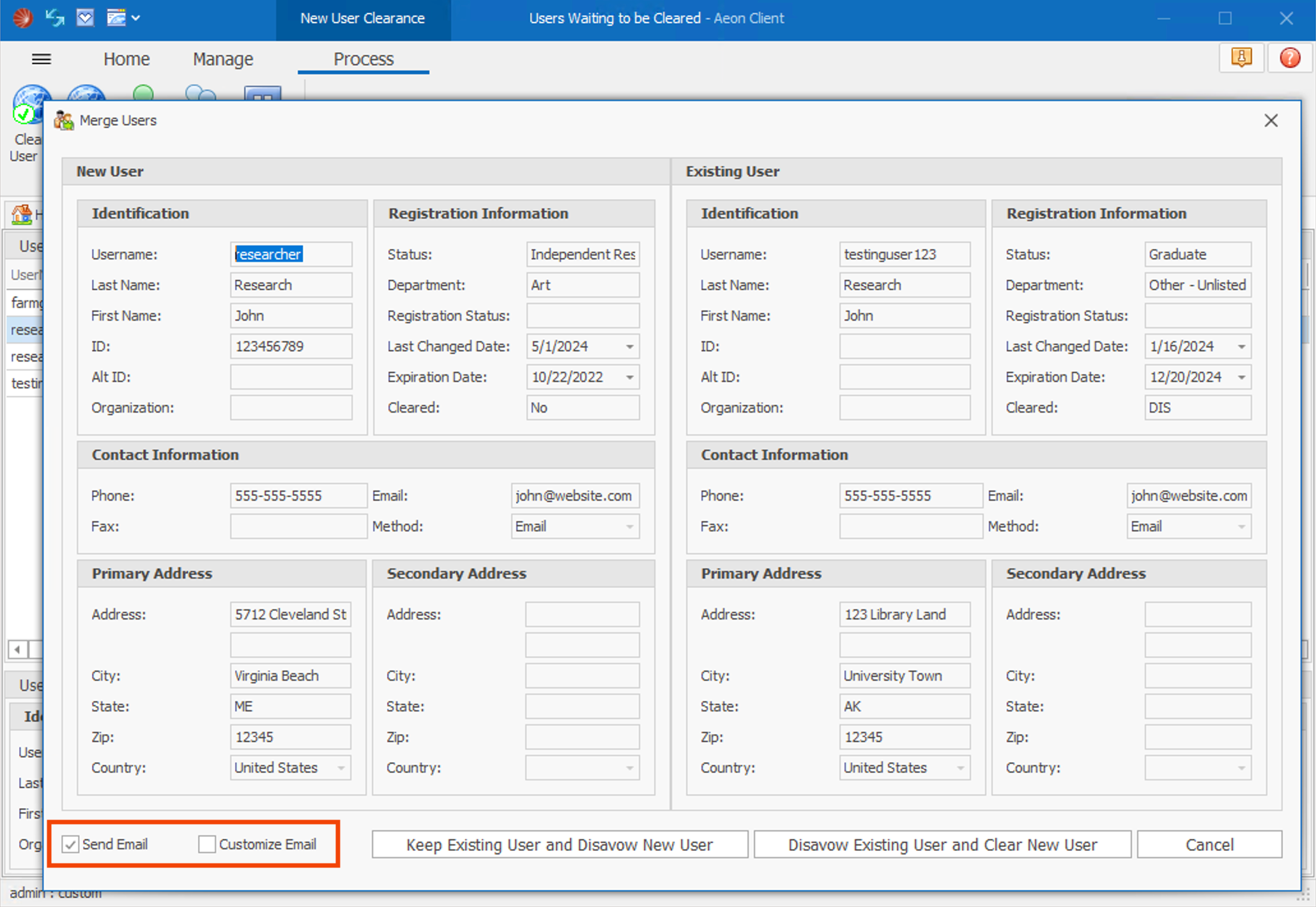 The Users Waiting to be Cleared form in the Aeon Desktop Client displays a Similar Users panel listing current users with similarities in the first name, last name or username, so staff can track and merge duplicate users easily. A single Merge Users template includes both existing and new user information fields and allows staff to merge either the existing user or the new user to eliminate duplicate users. An email can be sent to the disavowed user alerting them that their accounts have been merged.