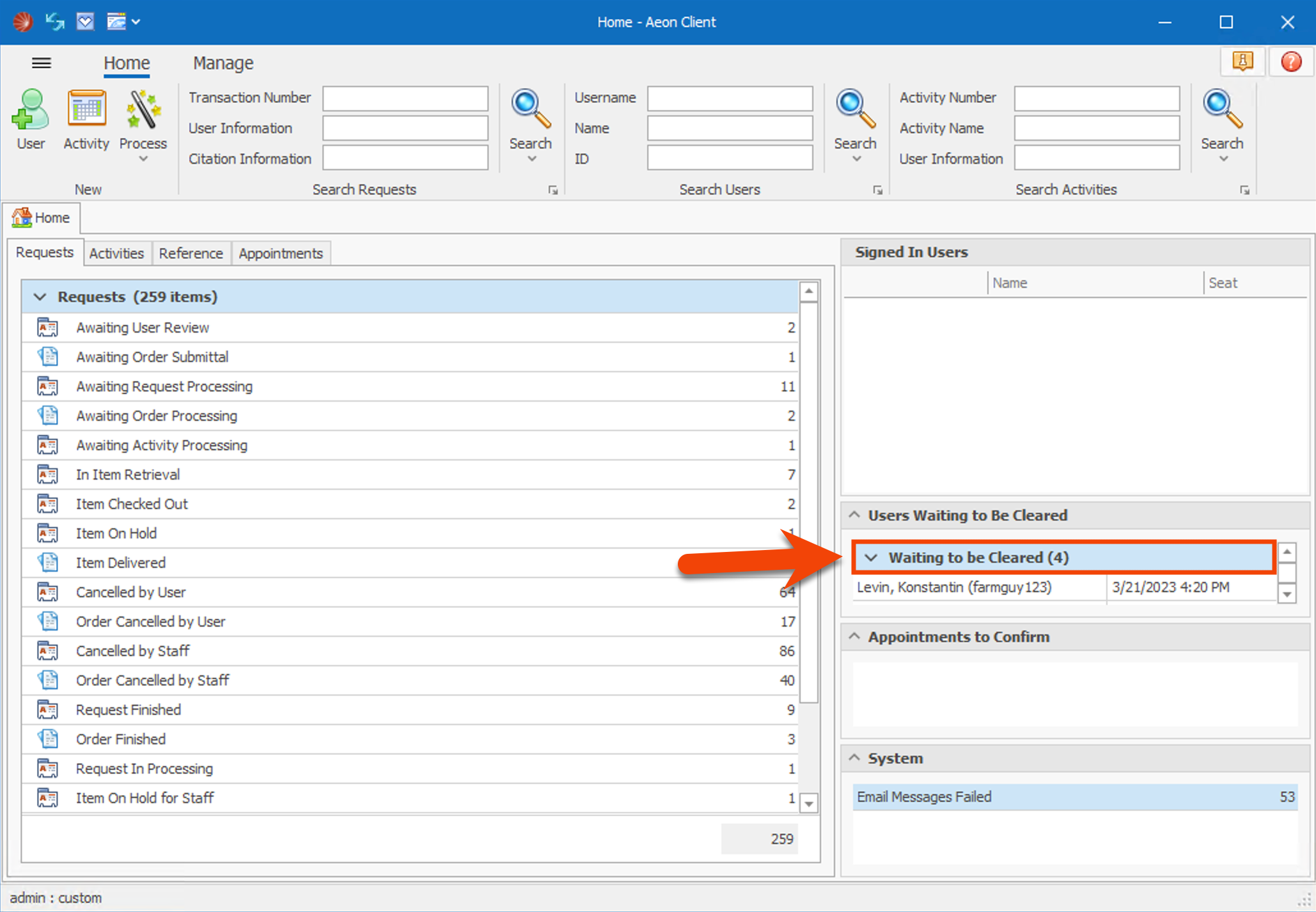 1. Double-click the Waiting to be Cleared header in the Users Waiting to be Cleared group on the Aeon Desktop Client Home page.