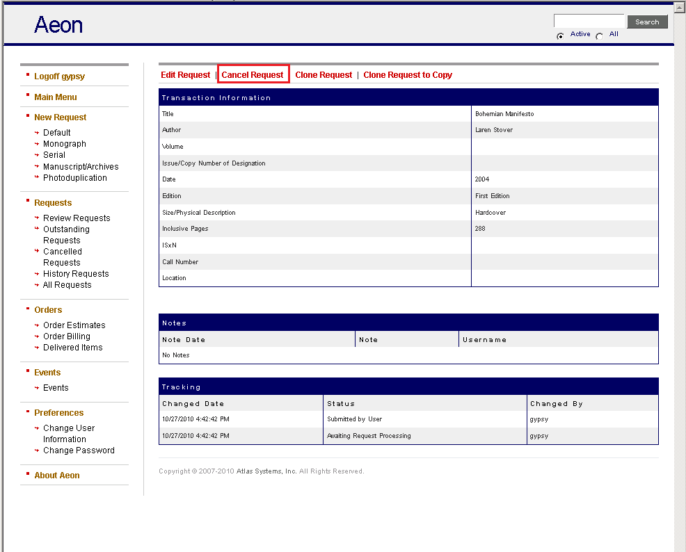 Active loan and photoduplication requests can be cancelled by the researcher from within the Aeon web account. The state of the active request determines if the request can be cancelled by the researcher.