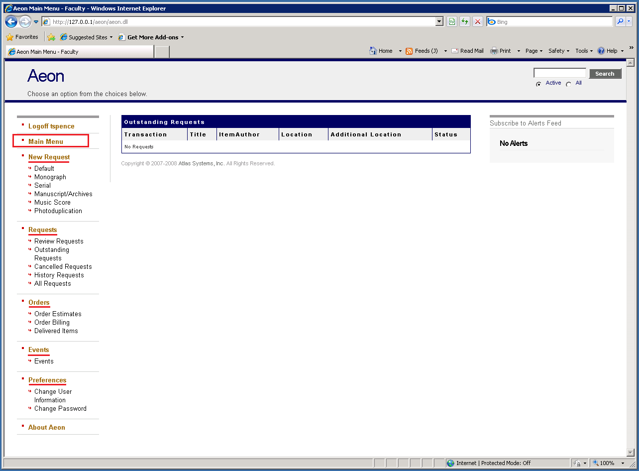 When a user logs into Aeon, they are taken to the Aeon Main Menu page. Once a new user has registered with the system and chosen an Aeon username and password, they are also taken directly to the Main Menu. From here, users can access the following menus: