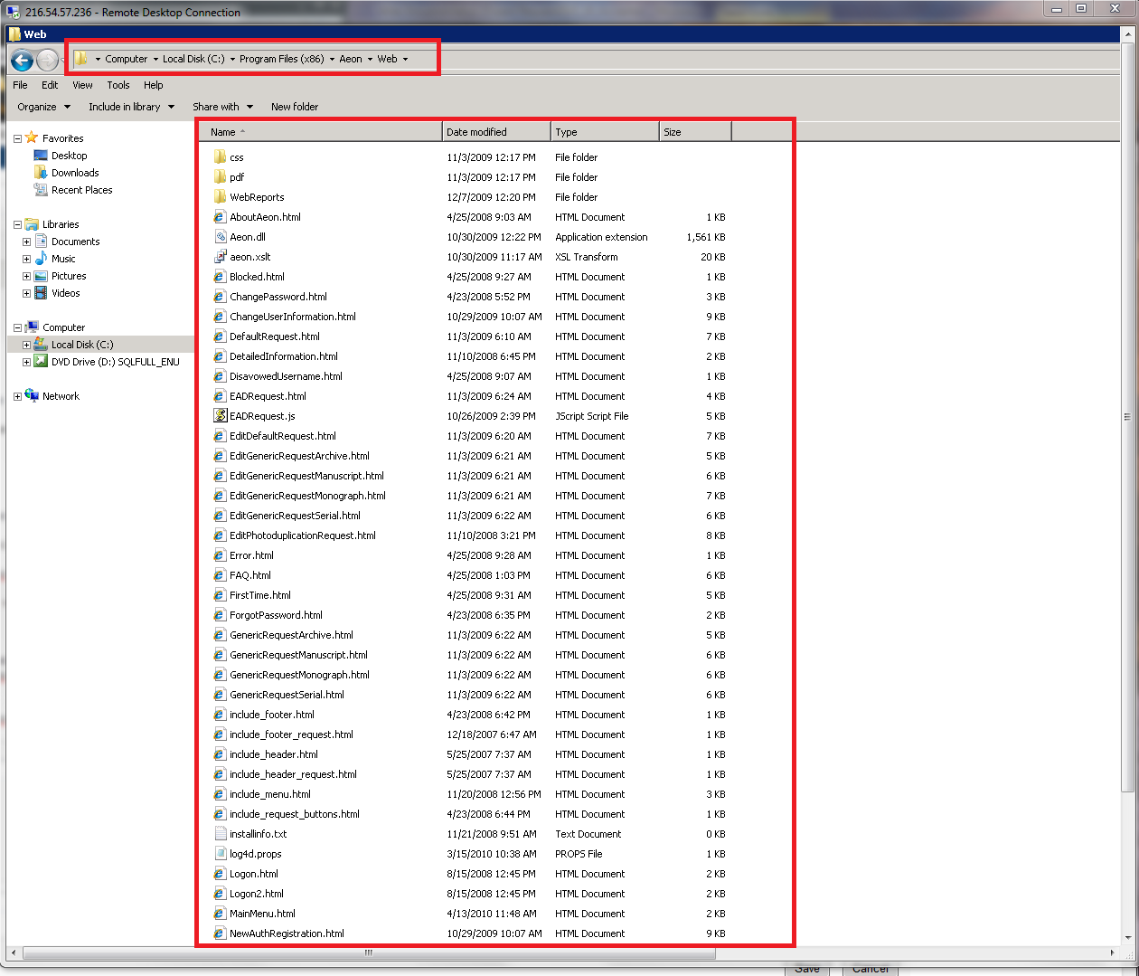 The Aeon Web folder also contains subfolders such as css, Email, js, and RIS. If you are using Photoduplication, you will store your pdf folder here as well so that your researchers have access to their pdf files.
