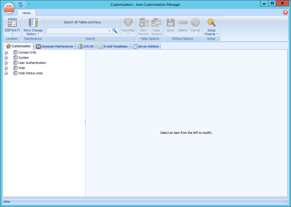 The Ares Customization Manager is where you set up and customize your Ares system settings. Customization keys and tables allow each institution to modify key aspects of the system based on their local needs and requirements. The keys and tables in the Customization Manager contain well-defined subcategories listing the keys and tables used to customize your system. In addition to the customization keys and tables, Semester Maintenance, Z39.50, Email Template and Server Addon settings are also customized here. Certain features of Ares can be customized quickly using the setup wizards in the Customization Manager.