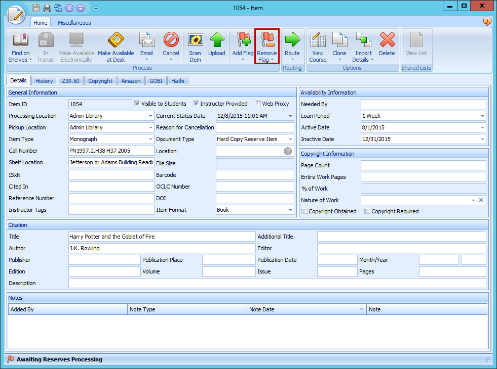 The Remove Flag button appears on the Item form and on lists of Item that are flagged. Removing a flag from an Item will remove the flag status, but the Item will remain in its processing queue (such as Awaiting Reserves Processing).