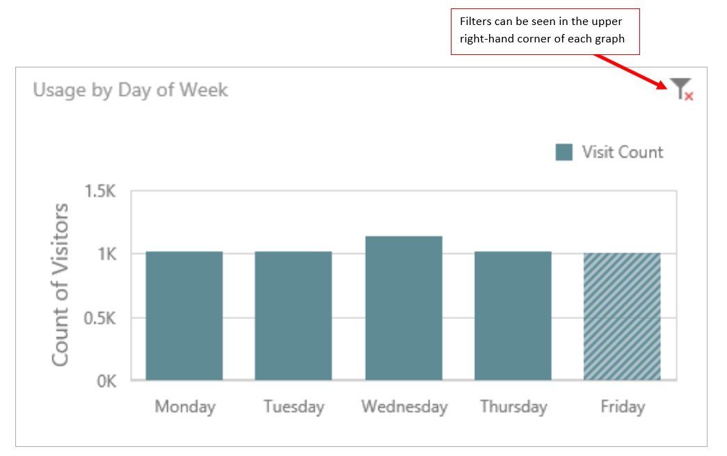 For any grid, pie chart or tree map (multi-colored boxes sized by amount), you can click on a section/row to narrow the results. Some charts offer a multiple-select filter option. Filters can be set by clicking on the filter icon next to the title of each graph. Filters set on a graph will show up in the upper right-hand corner like the picture shown below.