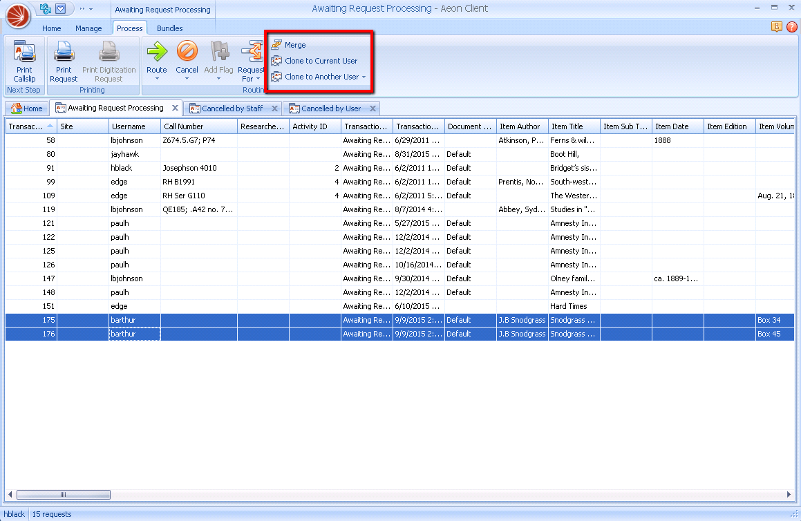 - In the Grid ** view of a request queue, the options ** Clone to Current User ** and ** Clone to Another User ** are available on the ** Process Ribbon.