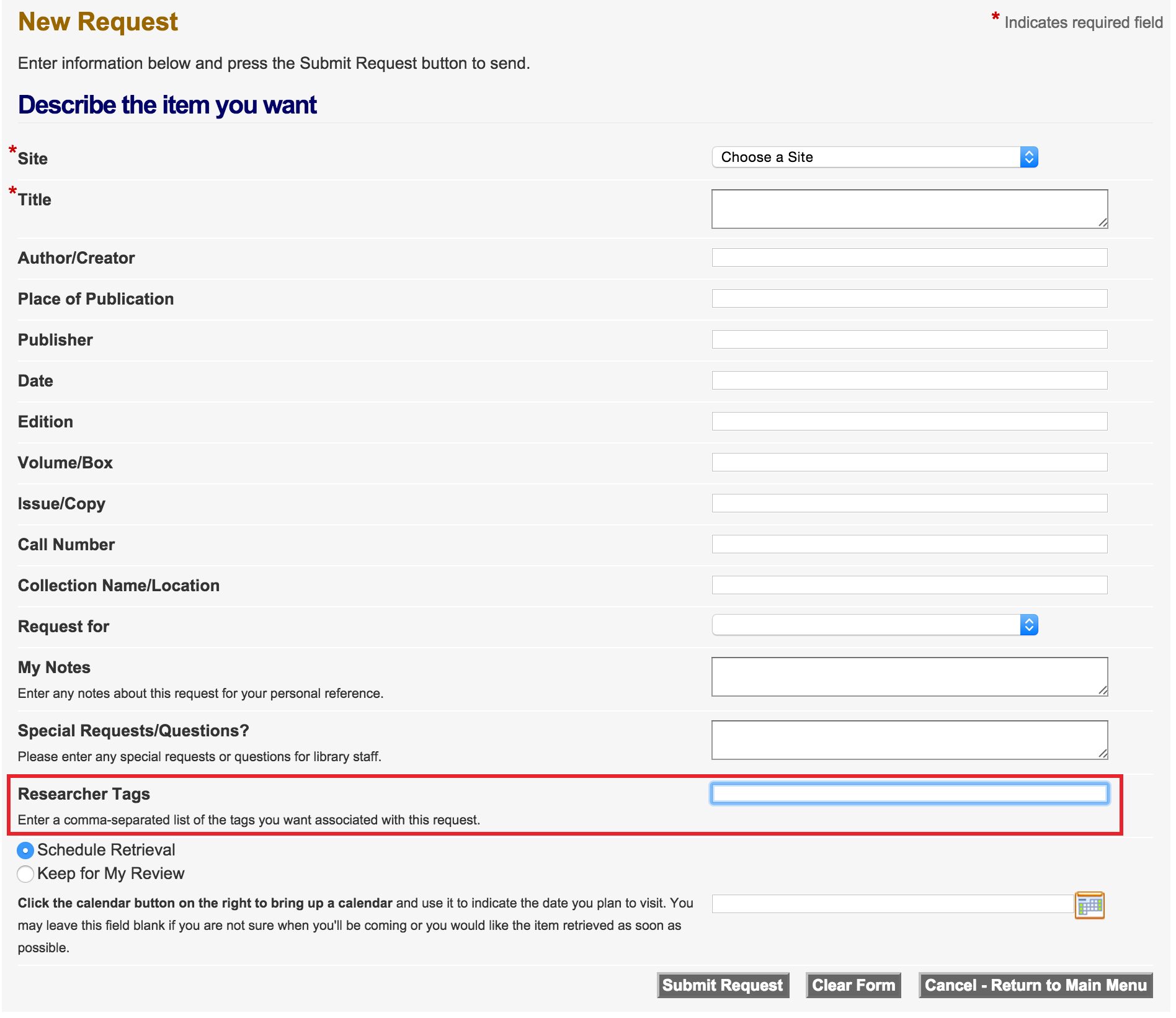 - In the field for Researcher Tags, enter any tags you want to add to the request. These tags should be comma-separated.