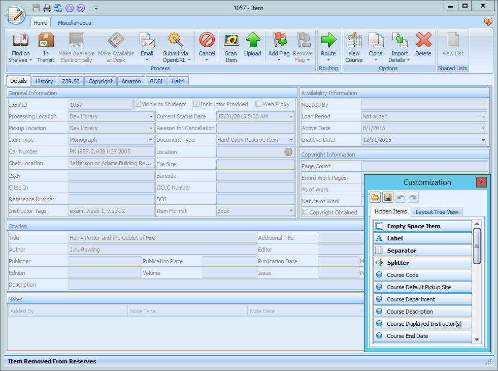 You can customize the Item and User forms to include additional hidden information that is not included by default. You may also remove fields you do not need. Customized forms are saved to your Ares client user account, which allows staff users to have separate customizations.