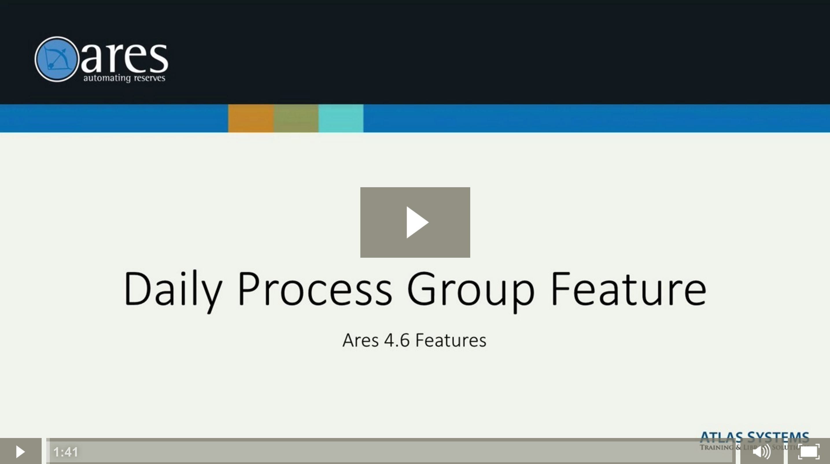 The Daily Process Group in the Ares Client provides a summary of daily processes at a glance on the Client dashboard. The following process creates a Daily Process report:
