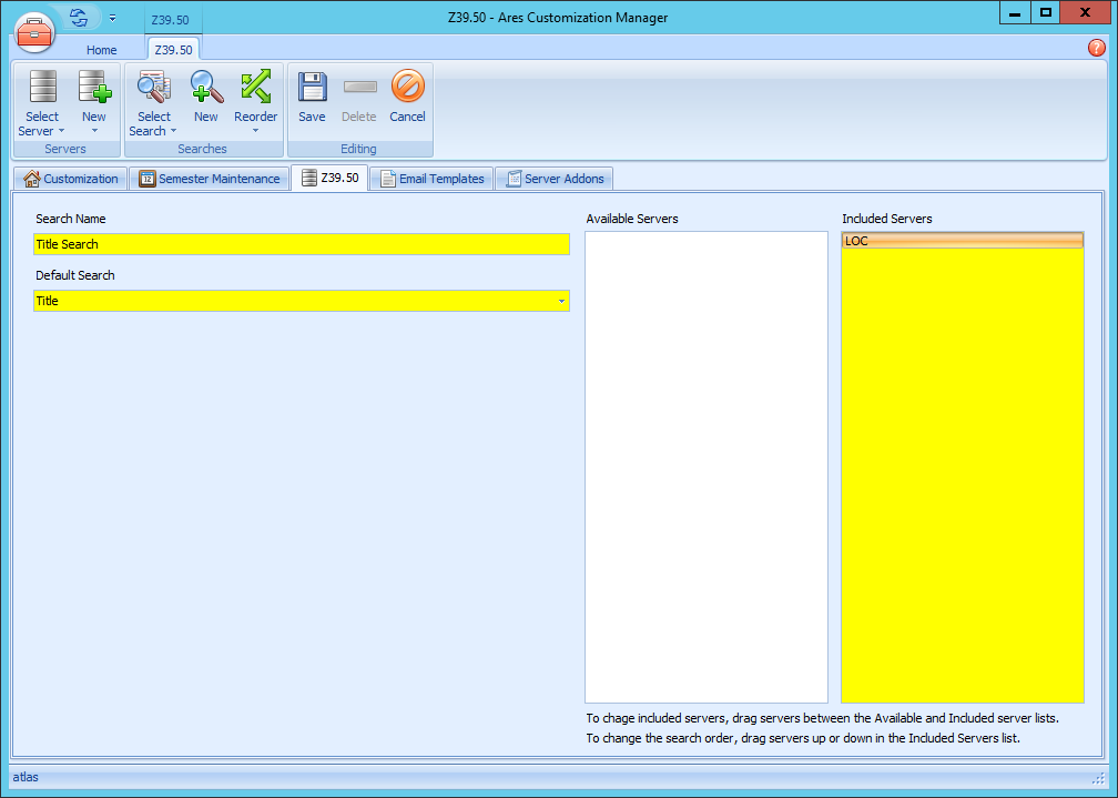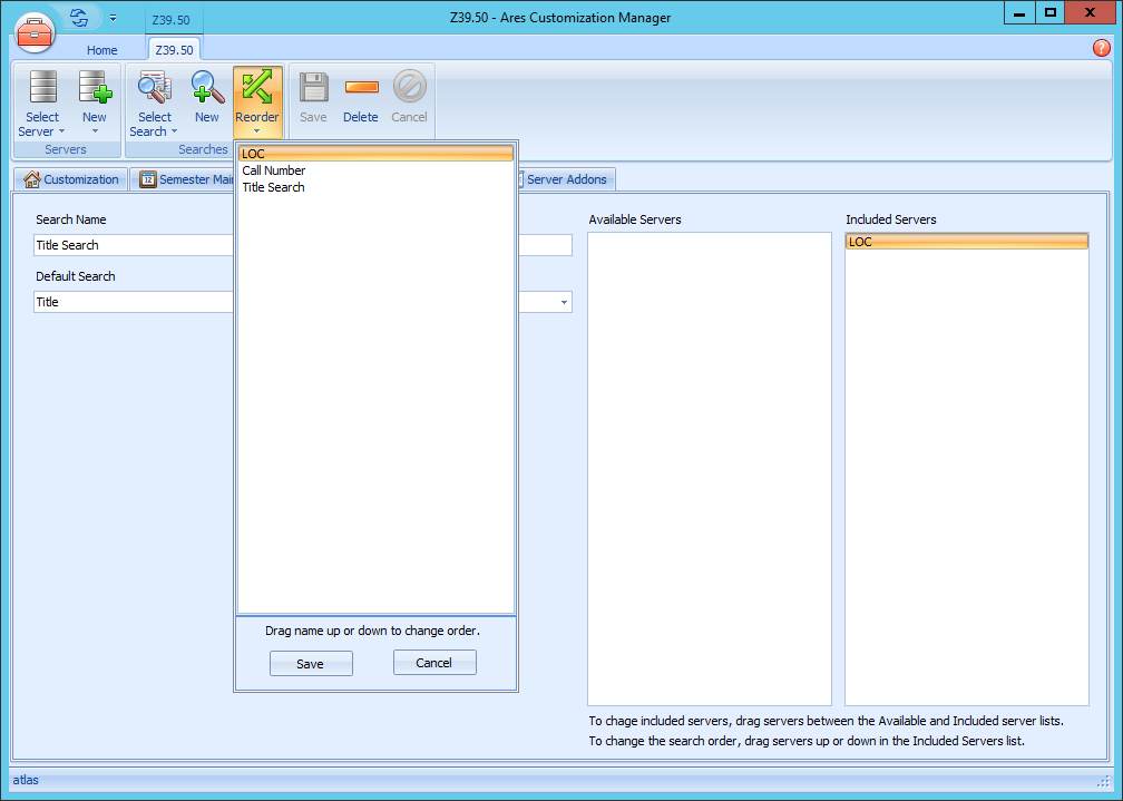To edit the order in which the searches display in the Ares Z39.50 Search form to make searching easier for your Reserves staff. Be aware that the first search in the list will be performed as the default auto-search, if configured, each time the form is opened in the Ares client.