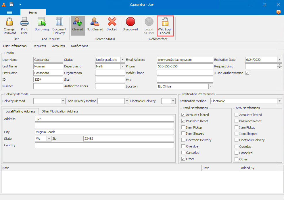 In ILLiad 9.1, the capability to temporarily block a web user after a configurable number of failed login attempts was added. If the UsingUserLockout Customization Key is enabled, Borrowing patrons will be locked out after failing a number of login attempts on the web; which is determined by the UserLoginAttemptsBeforeLock Customization Key. Successfully logging in before they are locked out will reset their FailedLoginCount to 0 for future sessions. Once a user is locked out, they will have to contact library staff to unlock their account and Reset the Password on the user form in the ILLiad client. A status line can be added using the SLUserLockedOut key to notify the patron when their account has been locked.