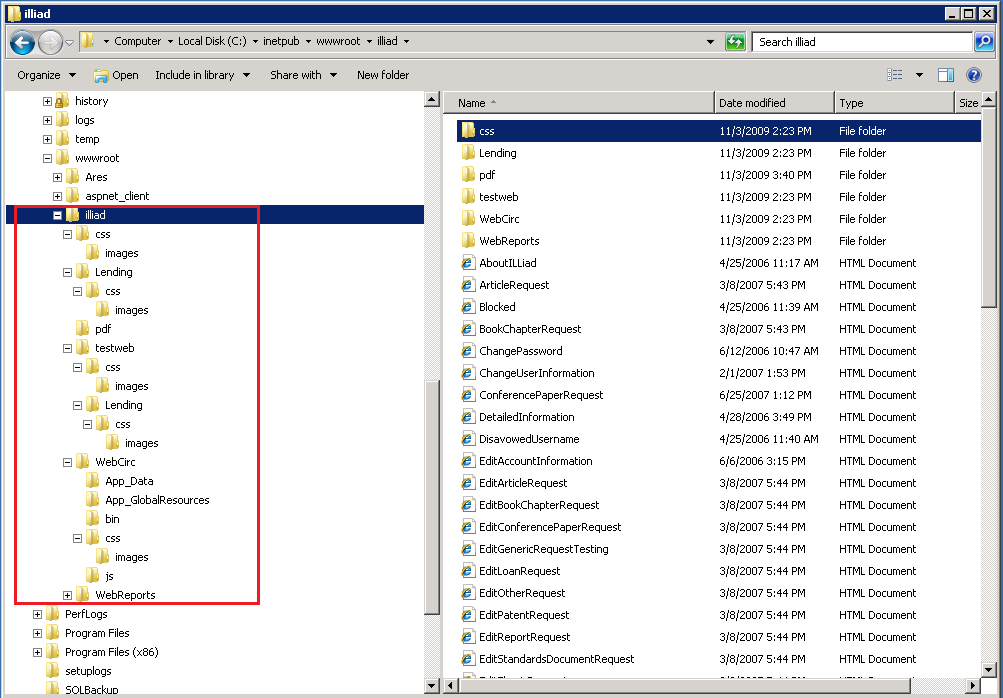 The ILLiad web site folder structure is set up in two main configurations, the Single Server and the Shared Server. The default location for the folder is c:\illiad\inetpub\wwwroot\illiad.