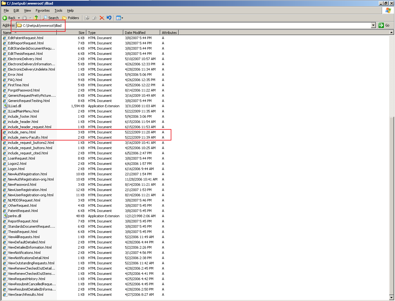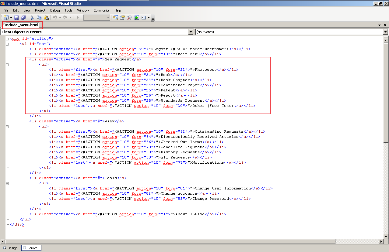 To create the Faculty-specific Thesis Request example mentioned above, you will copy, rename and save the default ILLiad web page that you wish to display differently based on patron type. In this case, it is the include_menu.html, embedded in the ILLiadMainMenu.html, that we are changing, to add a new request type. Rename the web page with a patron type suffix in the following format: