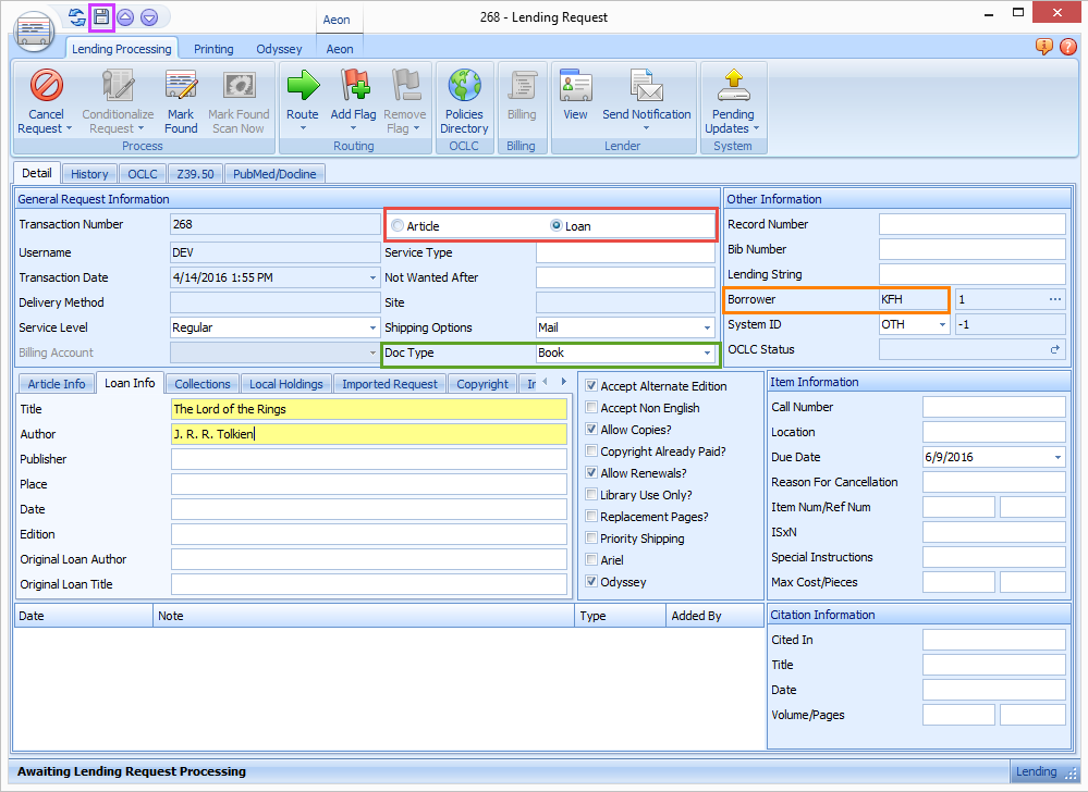 The request will be moved to Awaiting Lending Request Processing and can now be processed using standard workflows.
