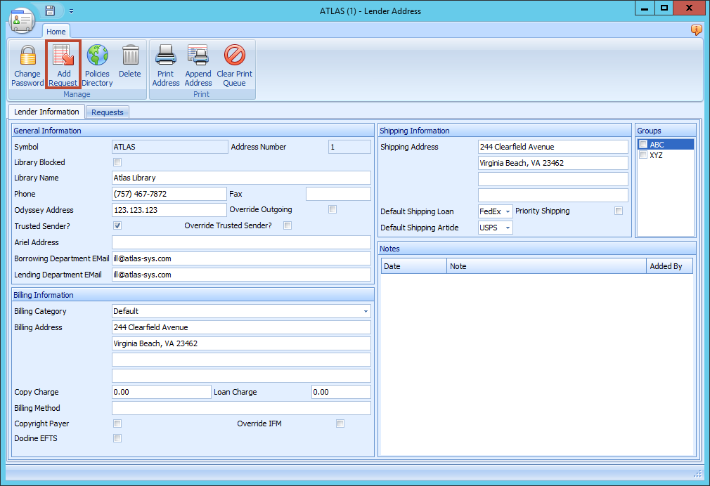 Search for the institution for which you wish to add a request manually by using the Search Addresses section of the Home Ribbon on the Main Page of the ILLiad Client. This will bring up the Search Address Results grid. Click on the Lender that you want to work with on the grid to open the Lender Address Form. This form will open automatically if you search for the full Lender Symbol, as there is only one match.