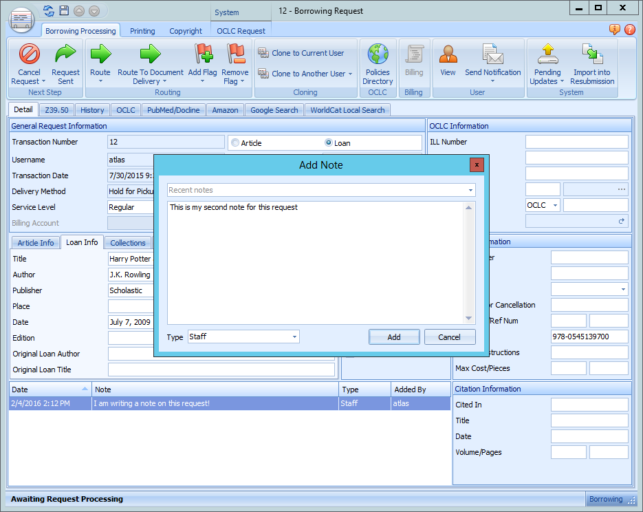 **Note (warning):** If staff manually add a Lender note to a request at any other point in the lending process, the borrowing library will not receive that note. The only other time a borrowing library will receive a note that was manually added by the lending library is when a request is conditionalized and contains a note with the type β€œStaff.”