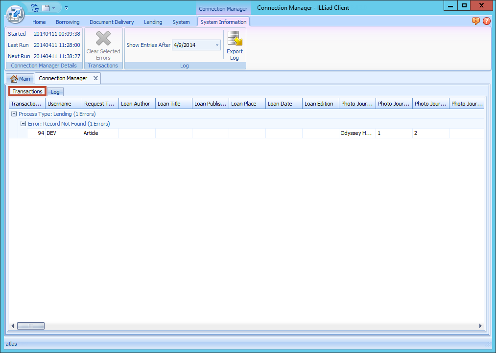 The Transactions Tab provides details of the errors that have been returned; the ILLiad Transaction Number appears in the error details, and the transaction can be opened from this grid. You access the transaction Request Form related to the error from the Transactions Tab.