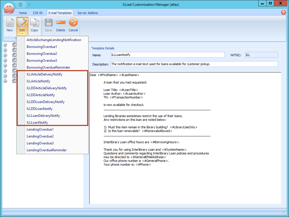 Some default email templates for Loans were added to the Customization Manager (starting in ILLiad 8.5) as database templates to facilitate this: