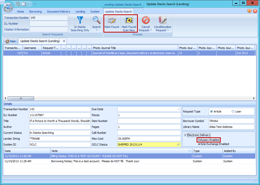 The Odyssey Enabled checkbox, (located in the Details section under the Borrower Symbol / Library Name fields on the Update Stacks Search form), designates a transaction as an Odyssey request. Because this checkbox is checked, the transaction will be routed to a status of Awaiting Lending Scanning, rather than Awaiting Shipping Label Printing or Request Finished, when the Mark Found button is clicked. If the Lending staff chooses to uncheck this checkbox during the Stacks Search Update, the transaction will then follow the normal ILLiad process and move to Awaiting Shipping Label Printing or Request Finished when the Mark Found button is clicked.