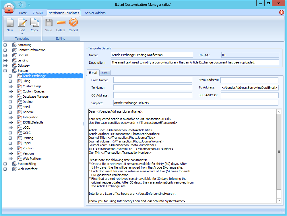 - Open the ILLiad Customization Manager and navigate to System | Article Exchange | SendArticleExchangeOnOdysseyFailure.