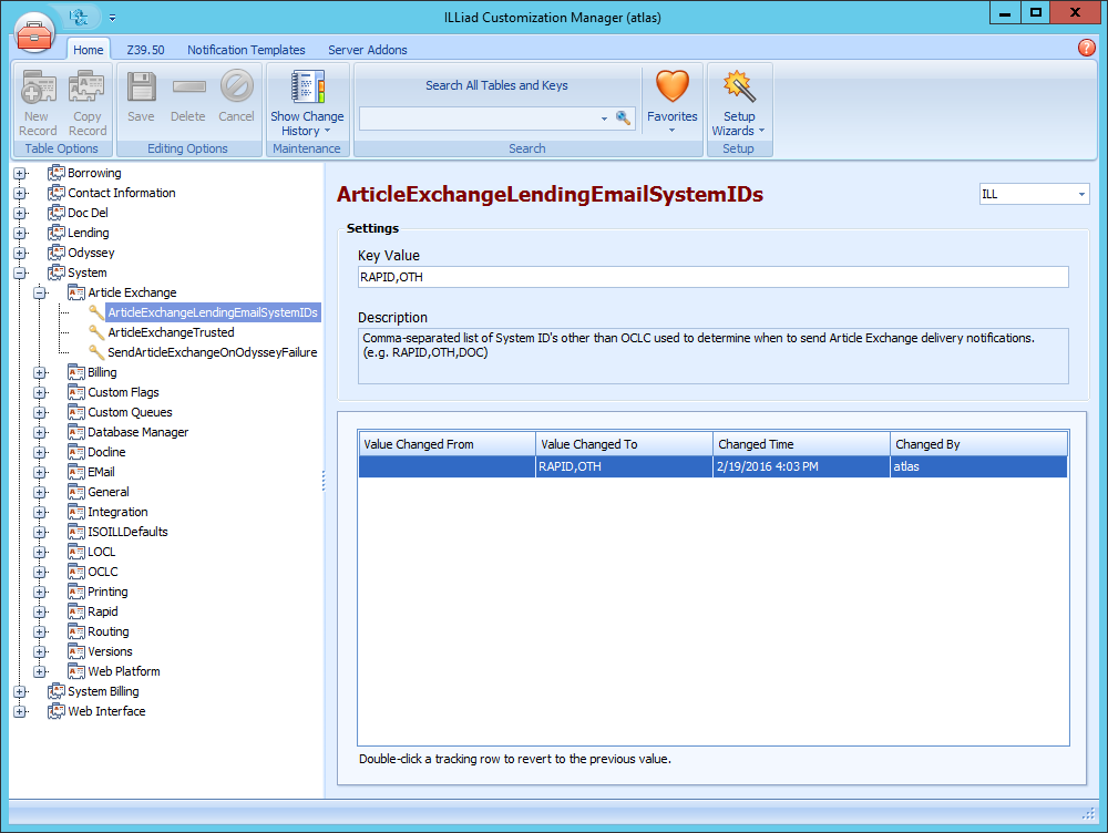- In the ILLiad Customization Manager, navigate to System | Article Exchange | ArticleExchangeLendingEmailSystemIDs.