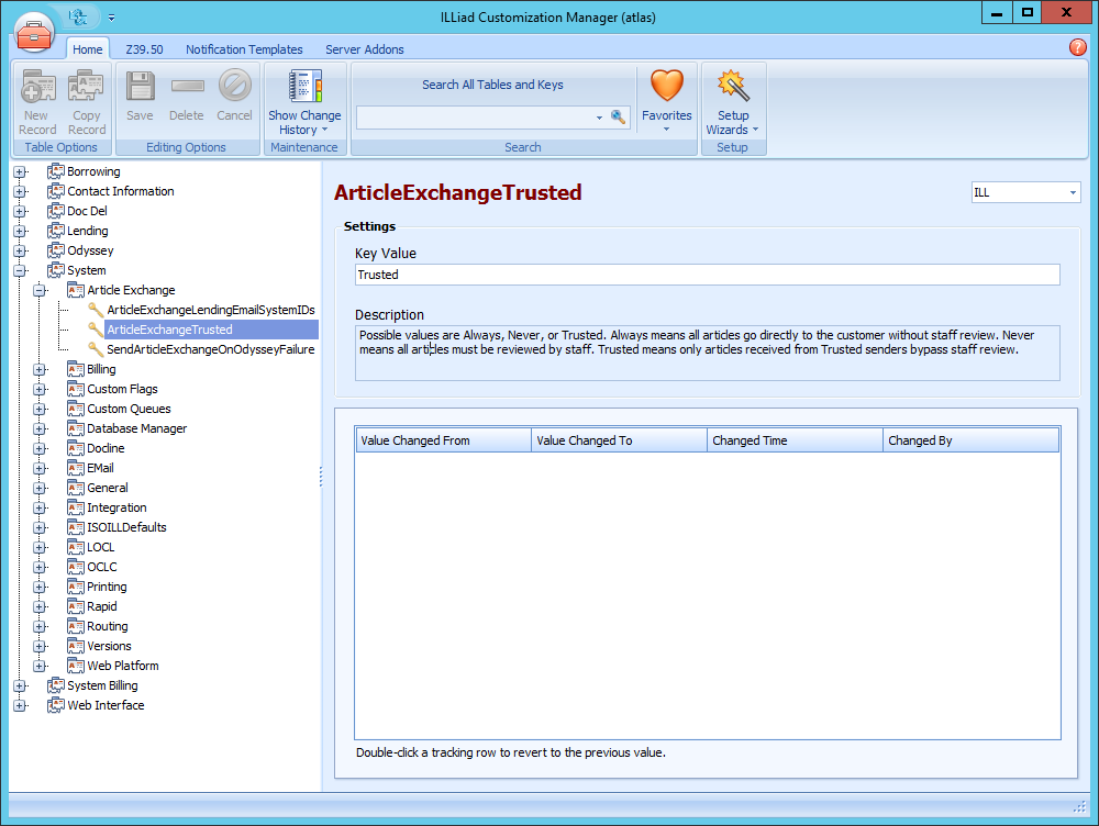 - In the ILLiad Customization Manager, navigate to System | Article Exchange | ArticleExchangeTrusted.