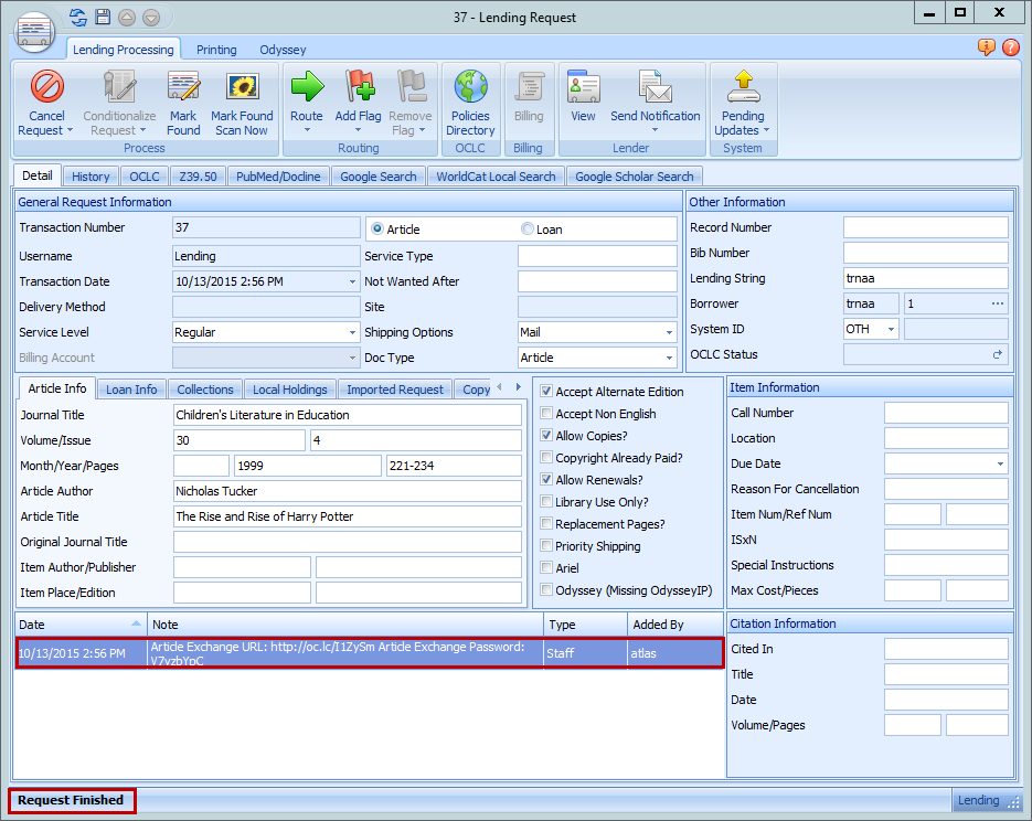 7. The status in ILLiad will be changed to Request Finished and the Article Exchange URL and Password will be added to the ILLiad notes.