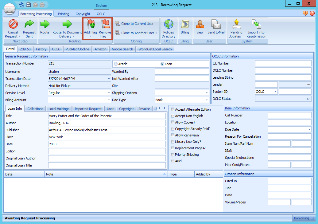 You can use custom request flags to mark requests for specific internal purposes. For example, you could create a flag to assign to requests that need to be reviewed by a supervisor. These flags are independent of the transaction status. Flags will display on the ILLiad main menu along with the status queues. Flags can be searched in ILLiad custom searching by using the CustomFlags table. You can search by Flag Name, ID, and NVTGC.