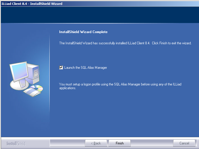- Click Finish to complete the installation. By default, the Launch the SQL Alias Manager box will be checked. You must setup a logon profile using the SQL Alias Manager before using any of the ILLiad applications.