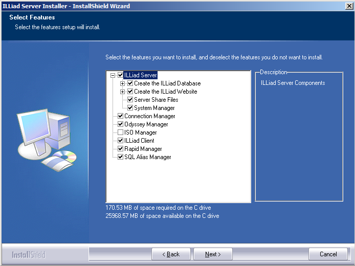 - Select the ILLiad features you would like to install. The ILLiad server, as well as the Connection Manager, Odyssey Manager, ILLiad Client, Rapid Manager, and SQL Alias Manager, are pre-selected for installation. Make any needed changes and click Next.