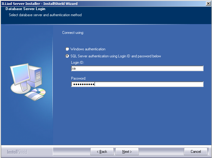 - Choose the option to connect using SQL server authentication. Log in using the administrator Login ID and password. Click Next.
