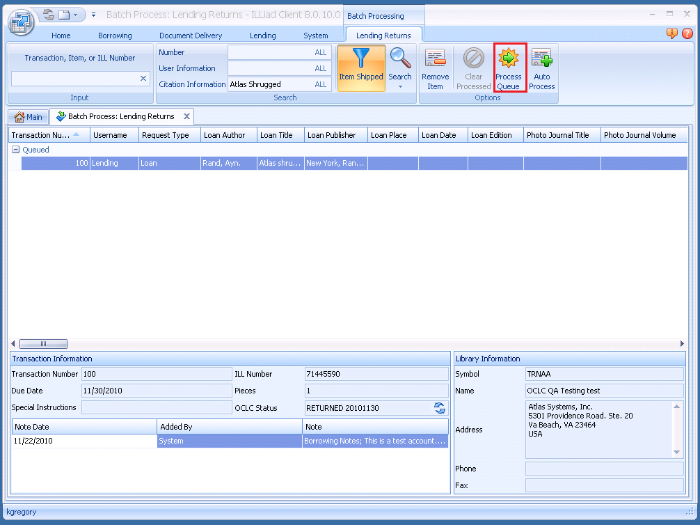 - The system will locate the item that matches the transaction number and displays the transaction record in the Batch Processing: Lending Returns grid.