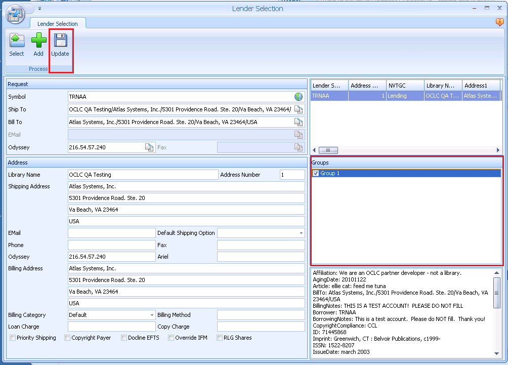To assign Borrowing institution to a statistical Group, you may do so on the Lender Selection form. The Groups pane in the middle of the right-hand side of the Lender Selection form displays all of the Groups you have created. To assign a group to the Borrowing institution for this transaction, click the checkbox next to the Group. Then click the Update icon to save the change. If a Library is marked as blocked in ILLiad, they cannot submit a request over the lending web or OCLC.