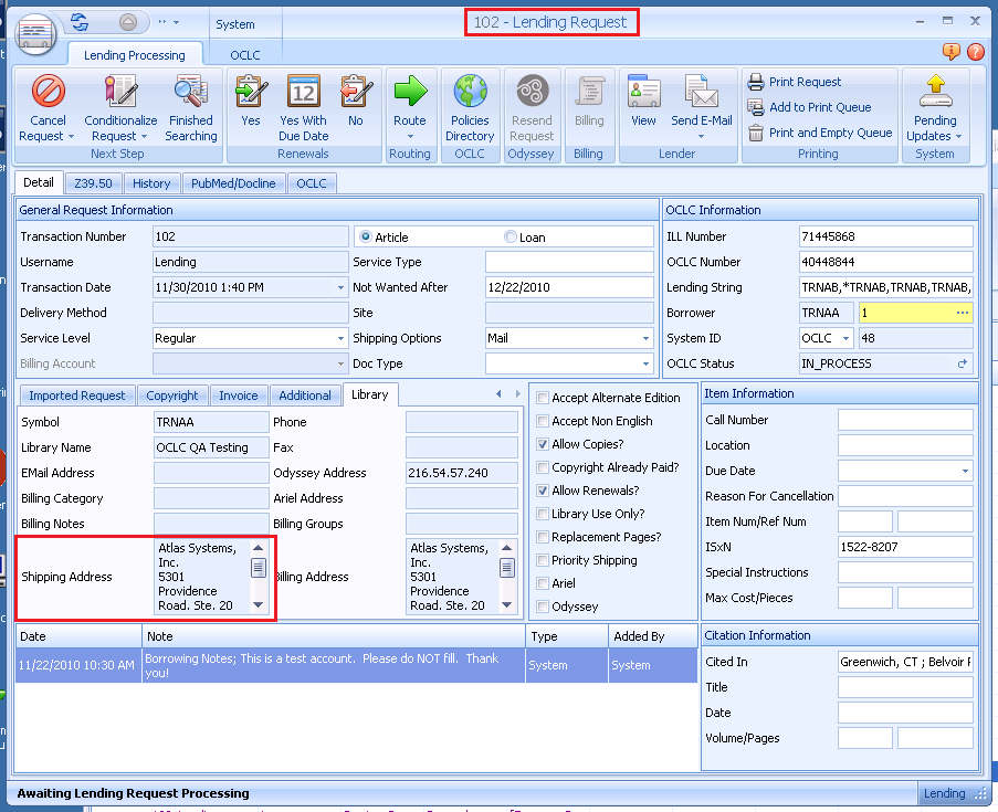 For each transaction, check that the shipping address in the Library tab of the Request form is the same as the address selected from the Lender Selection form. Libraries (particularly OCLC institutions) may have multiple addresses associated with the same symbol. Be sure that the correct address is selected for shipping and accountability. To choose an address, double-click on the number next to the address (i.e. #2) in the Lender Selection form and that address will show appear in the address box. An address must be selected for each request before finishing searching. For institutions with only one address option, ILLiad will select that address automatically. For multiple address institutions, you will have to select an address as a part of standard Lending request processing.