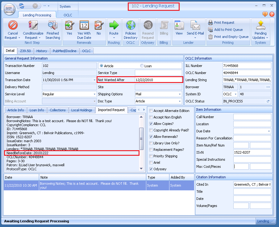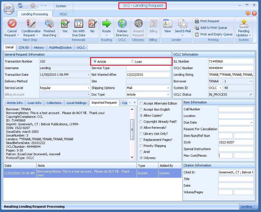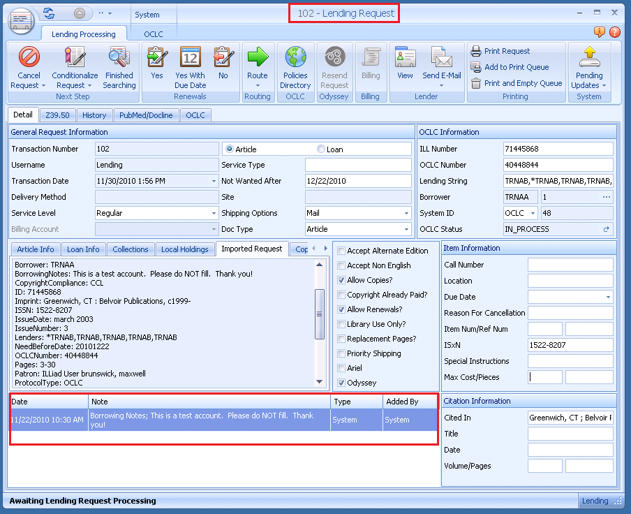 Check the Borrowing Notes field for any special instructions or requirements. The Borrowing Notes field may also be found in the Imported tab with the original captured request.