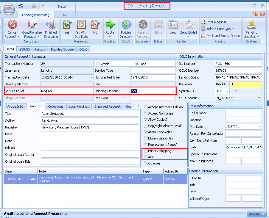 If a request needs to be changed to or from Priority Shipping or Ariel, check or uncheck the applicable box in the Item Information section of the Lending Request form and click the Save icon at the top of the form. If the service level should be changed to RUSH, use the Service Level drop-down under General Request Information to change it. Then save those changes. Service levels are set up in the Customization Manager.