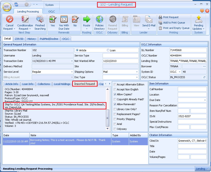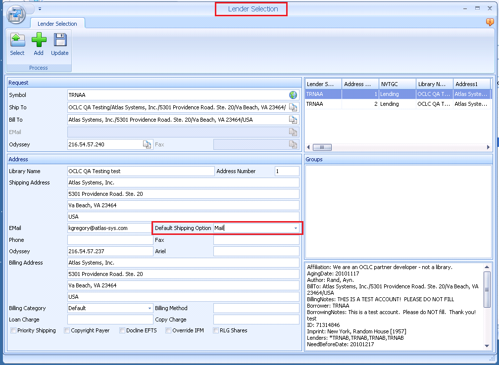 If the Lender symbol is not in the database, the Borrower information section of the Lender Selection form will be blank. You will need to add address information to that symbol. The borrowing institution's address information can usually be found in the original request. The Imported Request tab of the Lending Request form holds the entire OCLC or Docline request. Scroll down to see the entire request. Enter the address in the Address section of the Lender Selection form. Once the proper address information is entered, click on the Add icon on the Lender Selection form ribbon to update the system. ILLiad will now recognize the borrowing library's symbol for all future transactions.